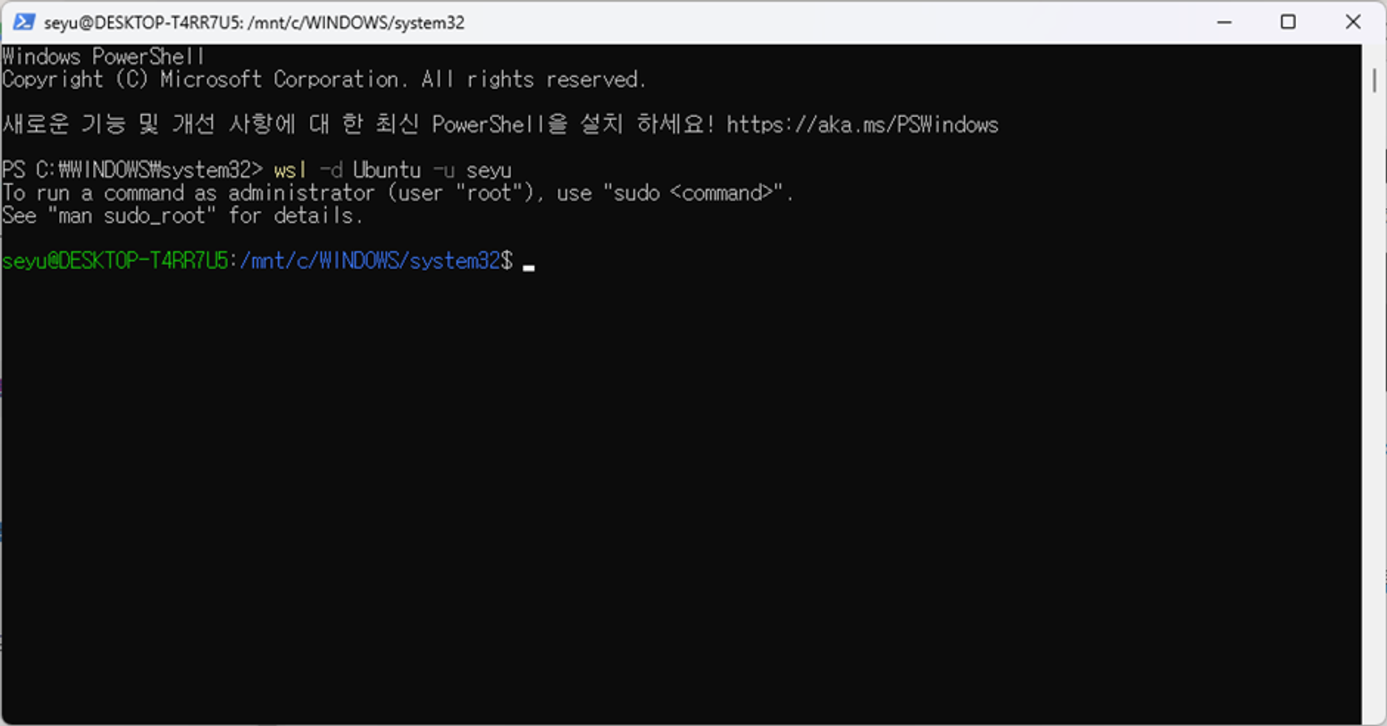또 power shell에서 직접 Ubuntu 배포판으로 접근하면 정상적으로 wsl을 띄울 수 있는 것으로 보아, 계정 자체 문제가 아닌 계정에 연결을 잘 시키면 된다는 것을 알 수 있다.