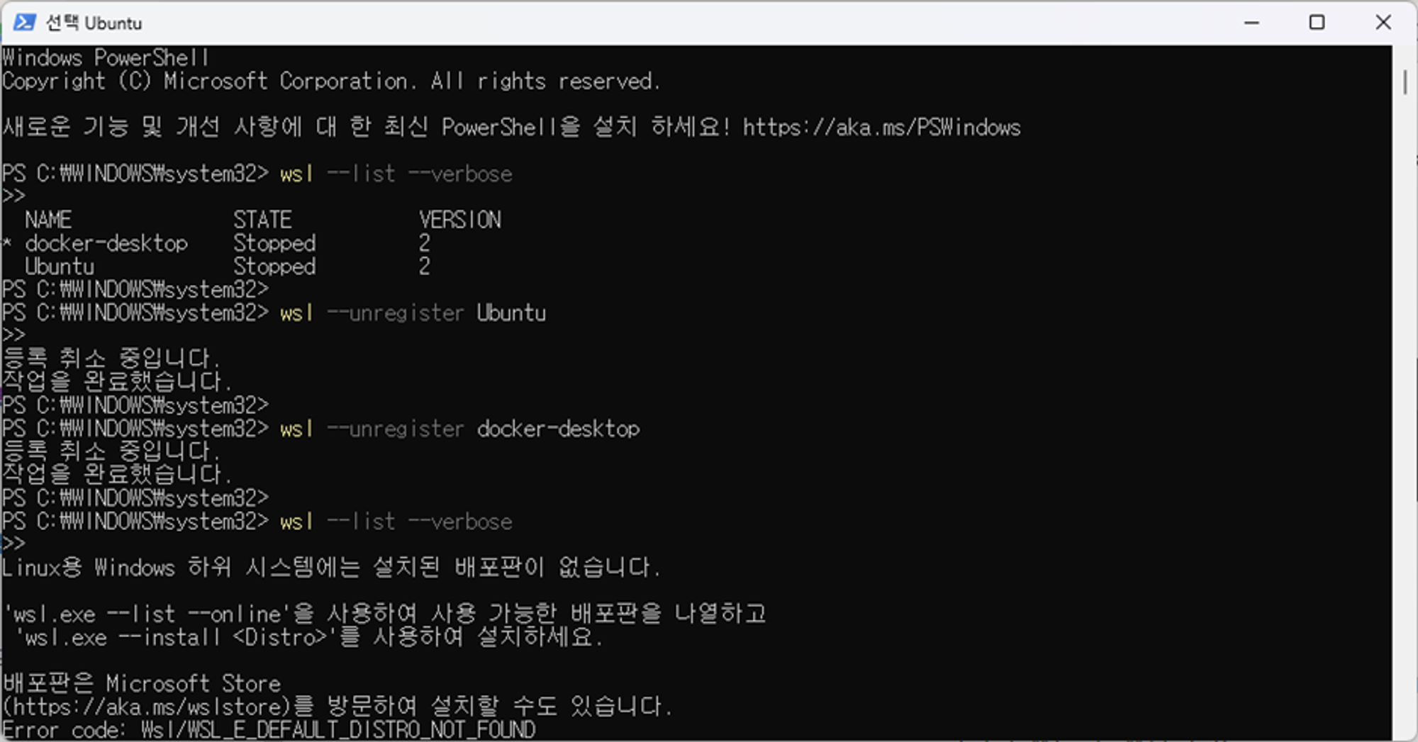 기존 설치한 계정을 지우지 않고 기본 배포판을 Ubuntu로 변경하는 코드는 다음과 같다.